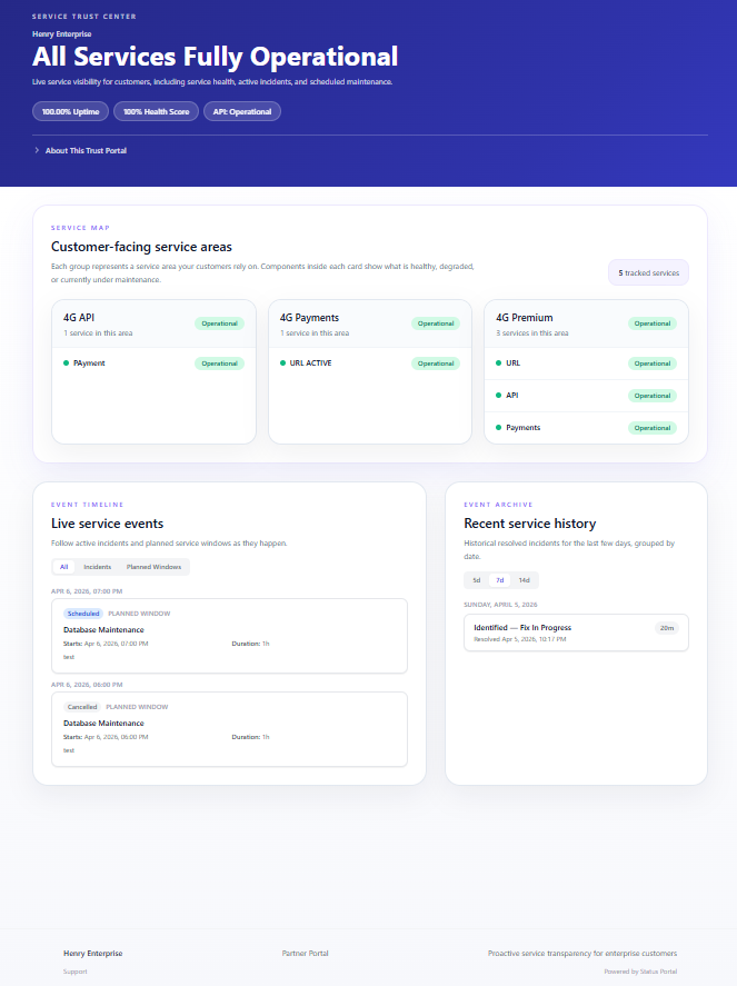 Customers see a clean public page with live component health, incident timelines, and planned maintenance the moment your team posts an update.